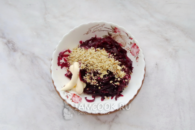 Свеклу отварите, охладите и очистите. Натрите на терке. Добавьте измельченные грецкие орехи и майонез. Перемешайте эти ингредиенты.