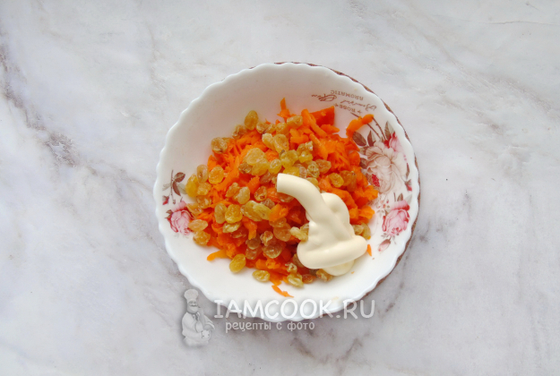 Морковь отварите, охладите и очистите. Натрите на терке. Изюм помойте и залейте кипятком на 5 минут, затем воду слейте. В миску выложите натертую морковь с изюмом. Добавьте майонез и перемешайте.