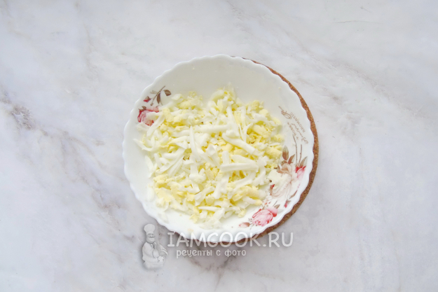 Яйца сварите вкрутую. Выложите в кастрюлю, залейте холодной водой, доведите до кипения. Варите 10 минут. Затем горячую воду слейте и залейте холодной водой. Когда яйца остынут, очистите их и натрите на терке.