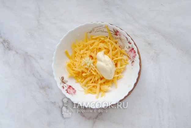 Сыр натрите на терке, добавьте измельченный чеснок и майонез, перемешайте.