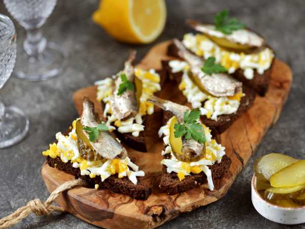 Уложите ломтики свежих и/или консервированных огурцов. Добавьте по две рыбки из банки со шпротами.
