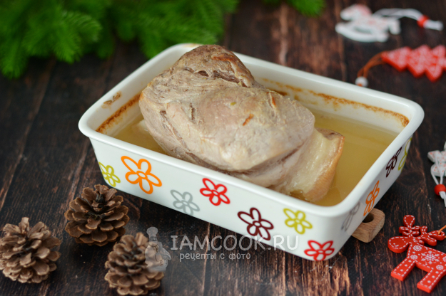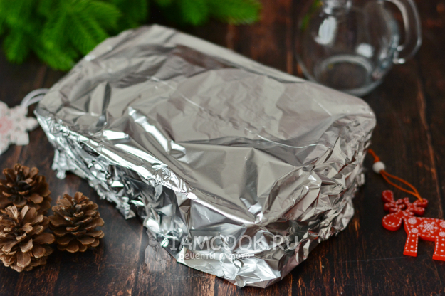 Форму с бужениной оберните плотно фольгой, затем отправьте в духовку. Готовьте при температуре 160-180°С примерно 1,5-2 часа, пока свинина не станет мягкой.