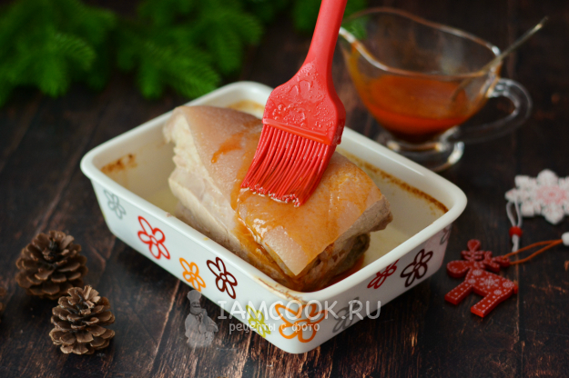 Из формы для запекания слейте весь рассол, в котором готовилась буженина. Буженину обмажьте со всех сторон глазурью при помощи кулинарной кисти.