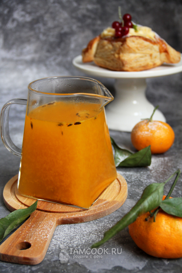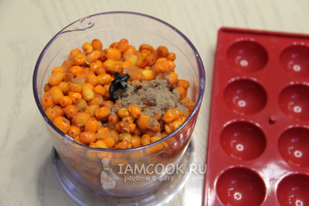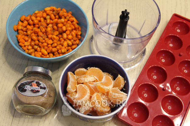 В чашу блендера выложить облепиху, дольки мандарина и корицу.