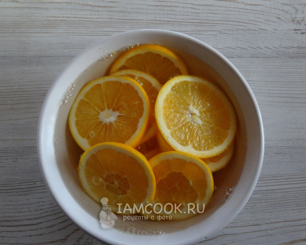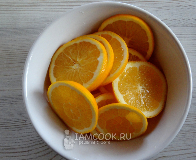 Апельсин тщательно вымыть. Нарезать тонкими кружочками.