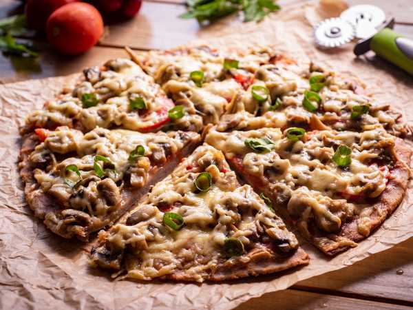 На обсыпанной мукой рабочей поверхности раскатаем тесто для пиццы в круг диаметром приблизительно 28 сантиметров (или растянем его). Если у вас духовка, а не профессиональная печь, то я очень рекомендую выкладывать основу для пиццы на пергаментную бумагу, чтобы потом её было легко переносить на раскалённые в духовке противни.