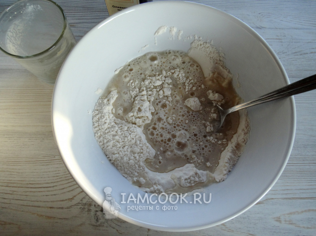 Просеянную муку смешать с мелкой солью. Влить дрожжевую воду и масло.