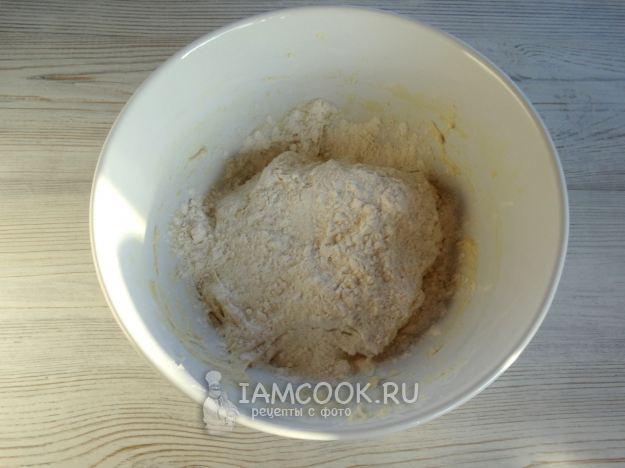 Затем добавить небольшое количество муки, чтобы тесто перестало быть жидким и сформировался шар.