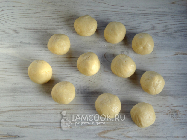 Разделить тесто на одинаковые кусочки, скатать шарики.