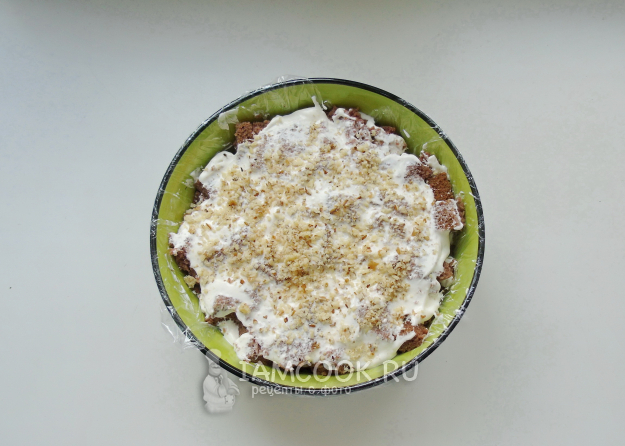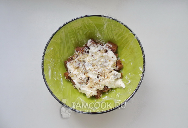 Так, чередуя кубики коржа с кремом и орехами, заполните всю миску.
