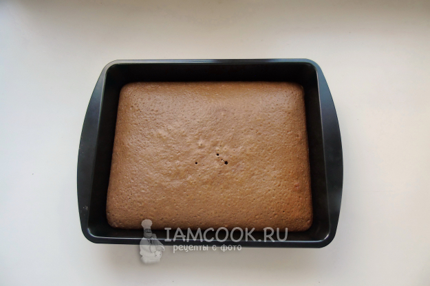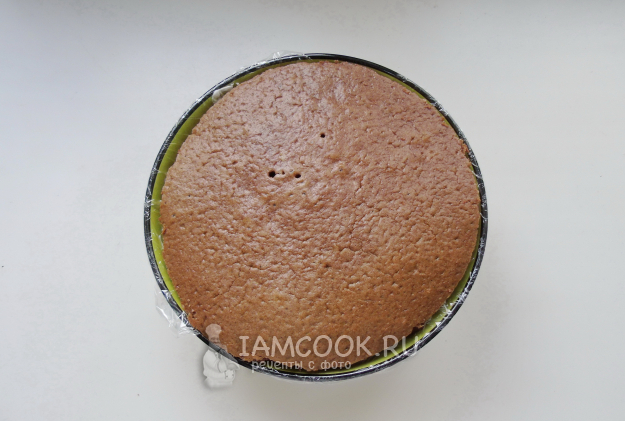 Поставьте в духовку, заранее разогретую до 170-175 градусов. Выпекайте корж 40-45 минут. Готовность проверьте деревянной шпажкой. При накалывании в середине коржа она должна выходить сухой.