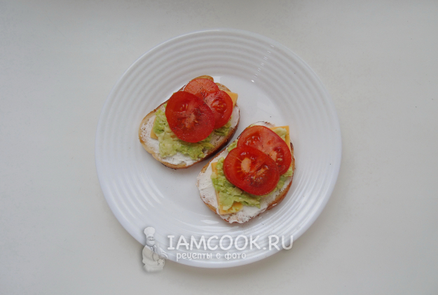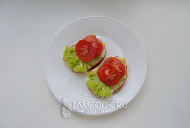 Помидор нарежьте и выложите на верх бутерброда. Посолите и поперчите.