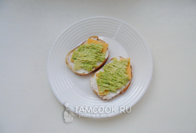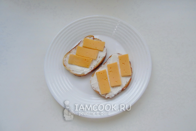 Смажьте их сливочным сыром и выложите кусочки твердого сыра.