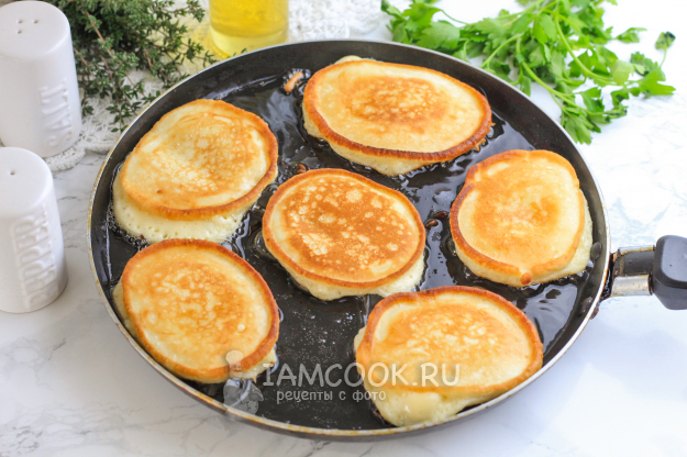 Разогрейте сковороду с растительным маслом в течение 2-3 минут и убавьте нагрев до умеренного, иначе оладьи быстро подгорят. Столовой ложкой выложите в масло немного теста и подрумяньте по 2-3 минуты с каждой стороны.