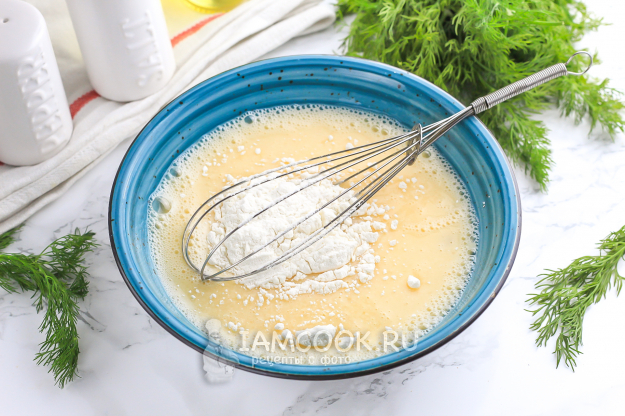 Всыпьте по частям пшеничную муку высшего сорта и добавьте разрыхлитель. Постарайтесь вмешать их так, чтобы не образовались комочки.