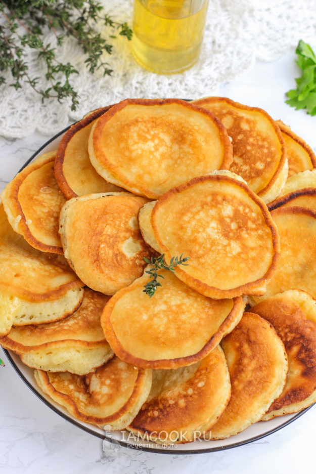 Выложите золотистые пышные оладьи из просроченного йогурта на тарелку и подайте к столу сразу же после жарки. Я подавала их с соусом тартар и форшмаком из сельди.