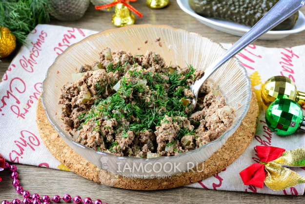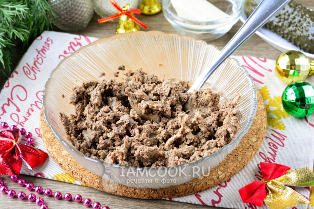 Обжаренную печень переложите в глубокую посуду, измельчите ее вилочкой. Можно использовать и блендер, но мне нравится, когда печенка более структурированная.