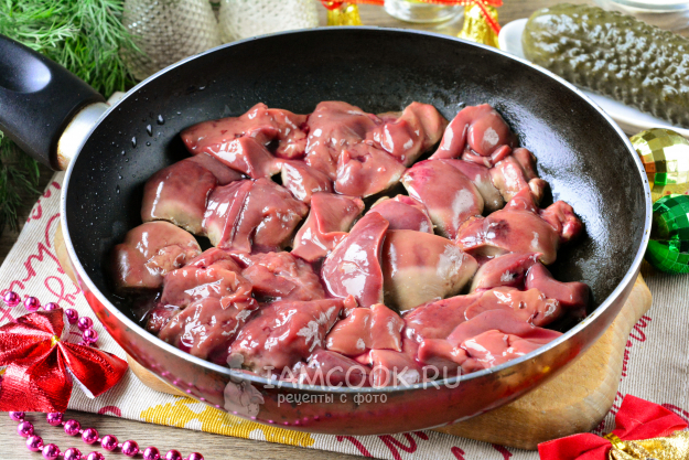 Куриную печень сполосните, срежьте пленки, затем нарежьте продукт средними кусочками. Растительное масло разогрейте на сковороде, включив средний огонь. Выложите туда всю печень.