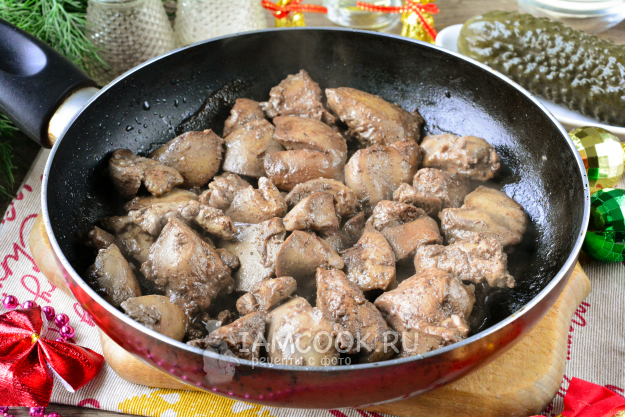 Куриную печень обжаривайте 10-12 минут, до готовности, помешивая, посолите и поперчите по вкусу.