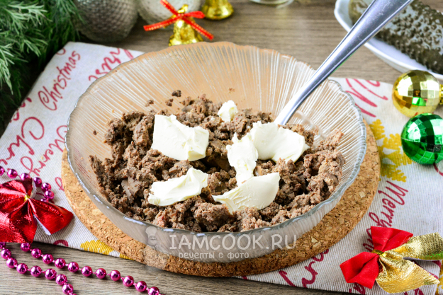Добавьте к печенке сливочное масло комнатной температуры, все размешайте до однородной консистенции. Масло сделает начинку более сочной, вкусной и нежной.