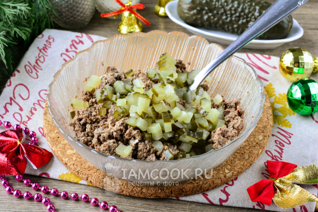 Соленые огурцы нарежьте мелкими кубиками и всыпьте в начинку.