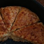 Делим сырное тесто для сконов на 2 части. Раскатываем одно тесто в круг толщиной 2 сантиметра и затем режем его на 8 частей.