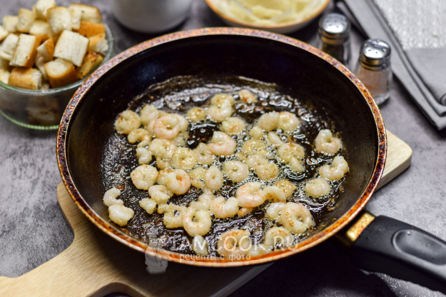 На отдельной сковороде растопите сливочное масло, выложите креветки и обжарьте несколько минут.