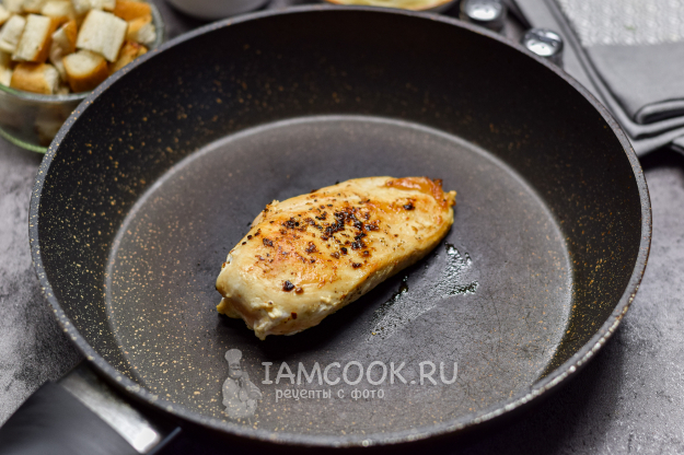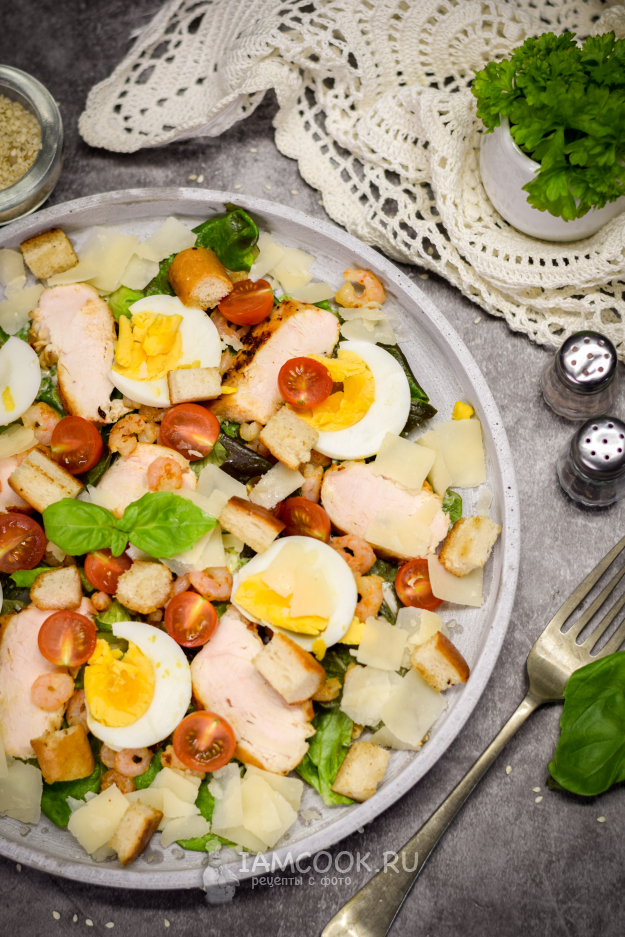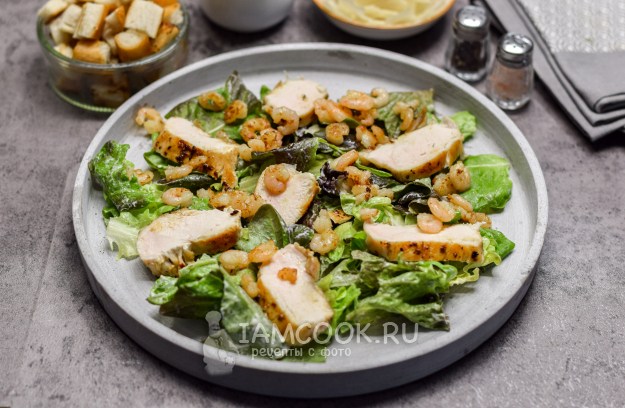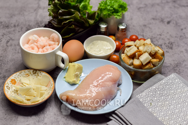 Соберите все необходимые продукты для салата «Цезарь» с курицей и креветками.