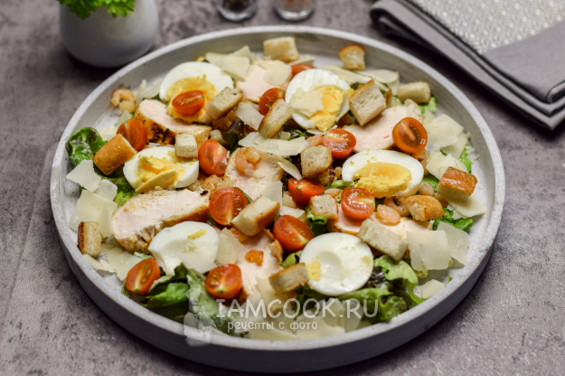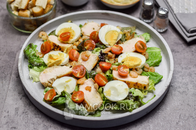 Добавьте в салат пармезан и сухарики. Салат «Цезарь» с курицей и креветками готов - можно подавать к столу.