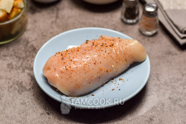 Куриное филе ополосните и просушите, после натрите филе любимыми специями.