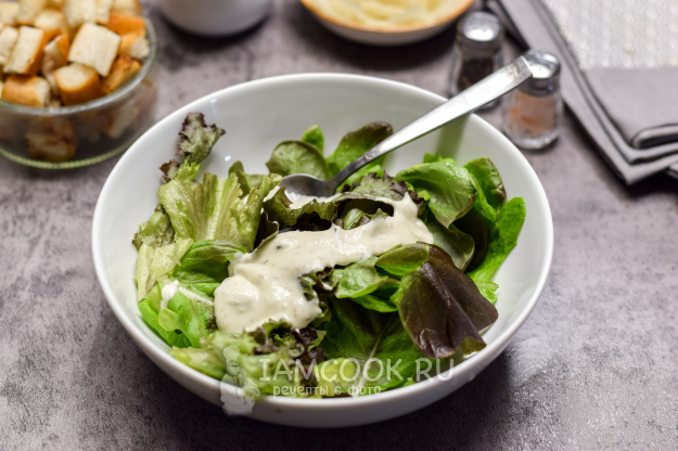 В салатник переложите порванные листья салата, добавьте к ним соус Цезарь и перемешайте хорошо руками.