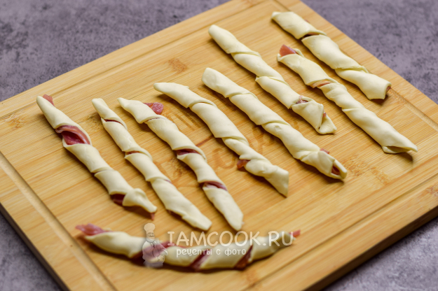 Подготовьте по списку все продукты для палочек из слоеного теста с беконом.