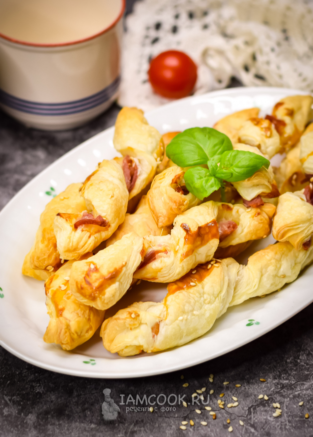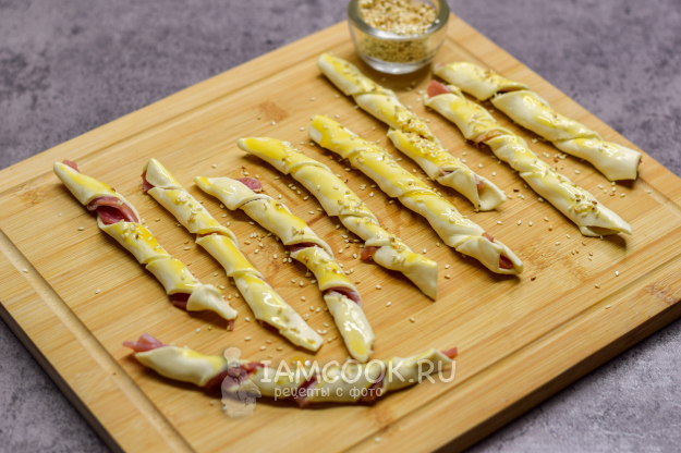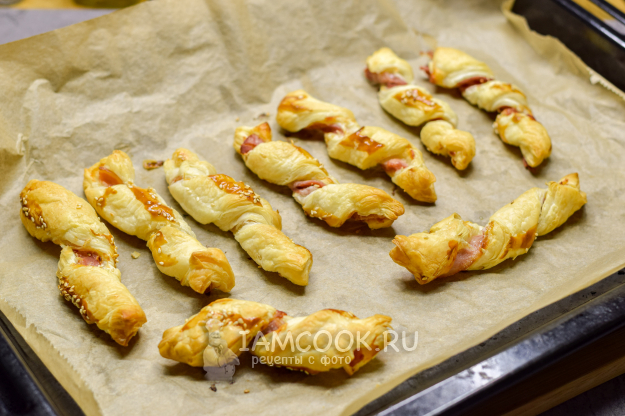 Запекайте закуску 20-25 минут - до золотистого цвета и готовности. Палочки из слоеного теста с беконом готовы к подаче.