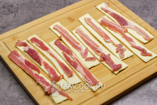 На каждую полоску теста выложите полоску бекона. Бекон лучше использовать копченый - так закуска в результате будет более ароматной и вкусной.
