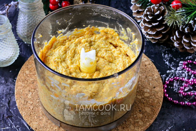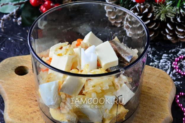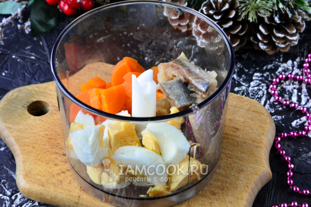 Заранее сваренную морковь почистите и нарежьте средними кусочками, сложите в чашу блендера. Туда же добавьте нарезанные отварные яйца и кусочки слабосоленой сельди (без кожи и костей).