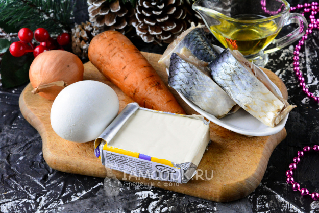 Соберите все ингредиенты для приготовления форшмака с плавленым сыром и морковью.