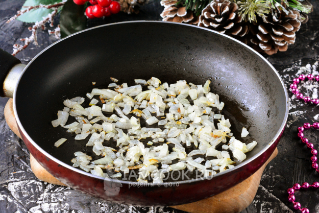 Репчатый лук нарежьте кубиками и обжаривайте на сковороде 2-3 минуты с добавлением растительного масла. Жарьте до прозрачности и легкого золотистого оттенка. Масла используйте совсем чуть-чуть, чтобы лук не получился сильно жирным. В крайнем случае чтобы убрать лишний жир, можете обжаренный лук выложить на бумажное полотенце.