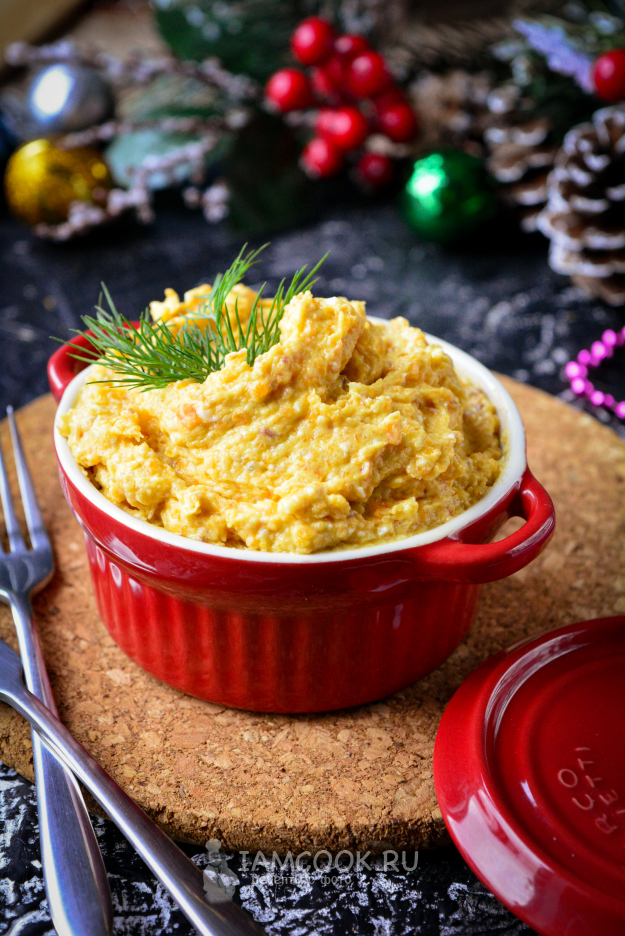Перекрутите все ингредиенты в блендере до однородной консистенции. Форшмак с плавленым сыром и морковью готов.