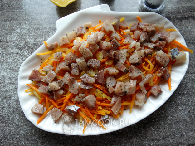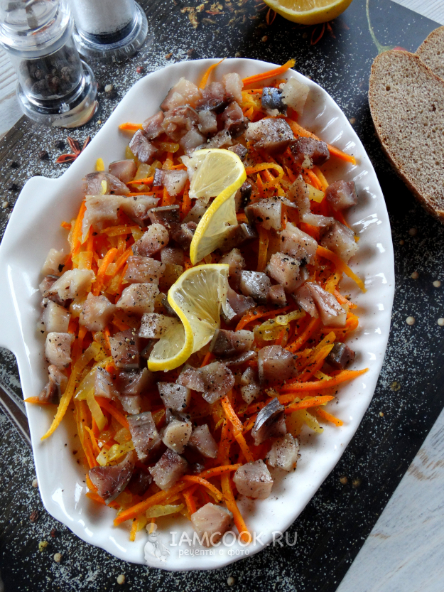 Салат без какой-то заправки, лишь поливается лимонным соком. После дегустации мы с мужем решили, что интереснее было бы заправить морковь с луком лёгким уксусным раствором. Но это дело вкуса!