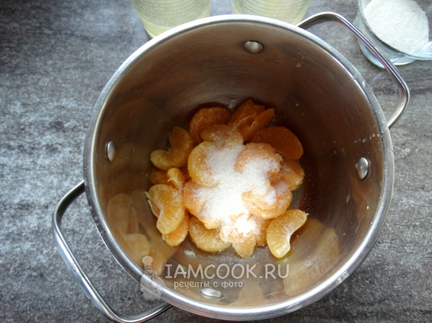 Мандарины почистить, желательно и от белых плёночек (иначе будет горчить). Добавить сахар.