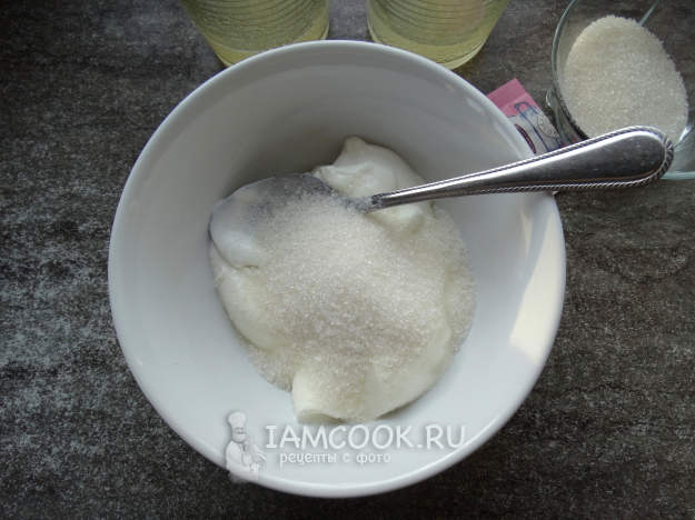 Сметану перемешать с сахаром и ванилином, убрать в сторонку, чтобы сахар полностью растворился.