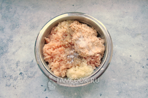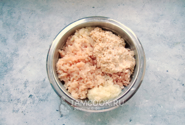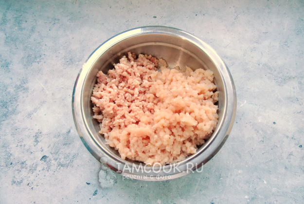 Мякоть свинины и куриное филе помойте и пропустите через мясорубку.