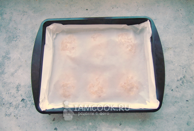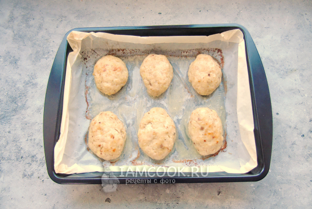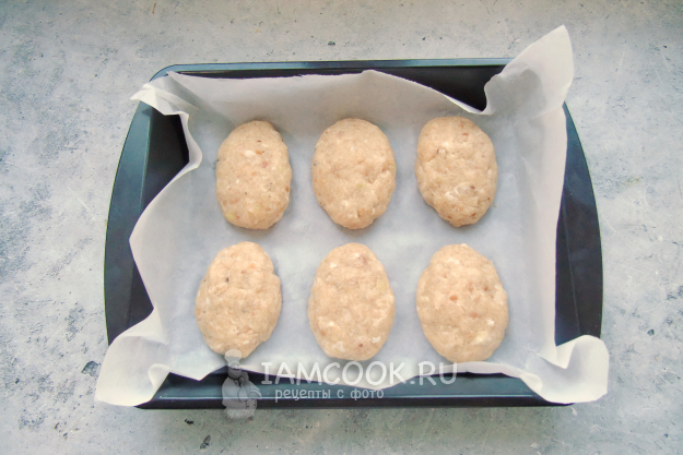 В форму для запекания постелите пергамент. У меня бумага с силиконовым покрытием. Из фарша сформируйте котлеты и выложите на пергамент.