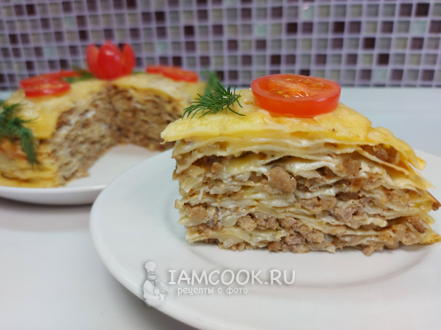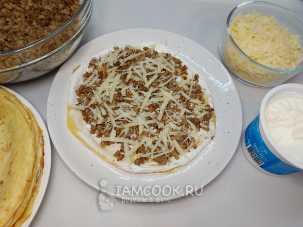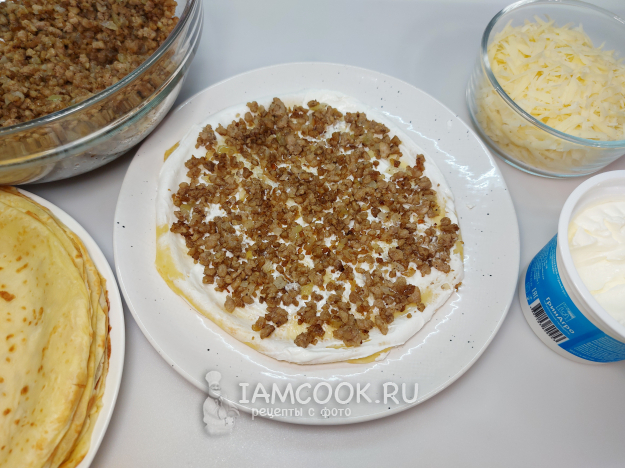 Фарш посыпаю небольшим количеством тёртого сыра. Он расплавится и скрепит все слои. Таким образом собираю весь торт, пока не закончатся блины.