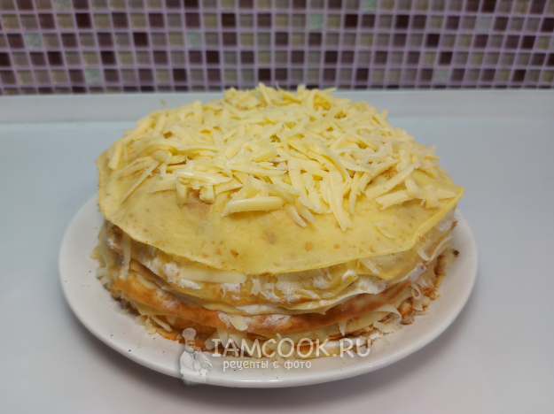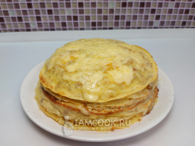 На самый последний верхний блинчик нужен только сыр. Кладите побольше, чем между слоями, чтобы получилась запечённая корочка.