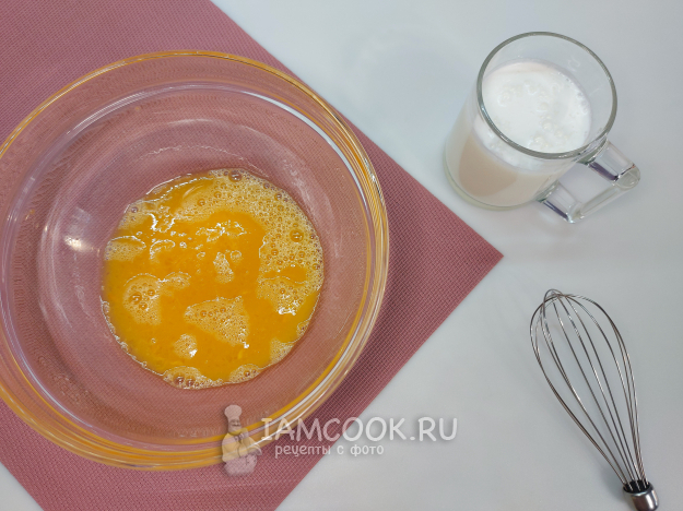 В первую очередь приготовлю тесто для блинов, чтобы перед жаркой оно успело постоять минут 20-30. В удобной посуде для взбивания смешиваю яйца, сахар и соль.