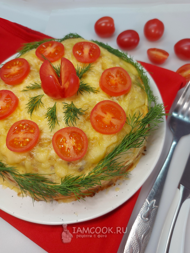Отправляю торт в разогретую духовку на 15 минут при 180 градусах. Если духовки нет, можно поставить его на пару минут в микроволновку, чтобы расплавился сыр.