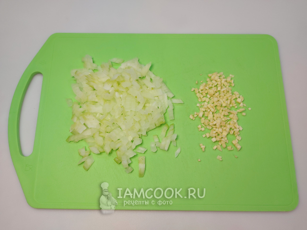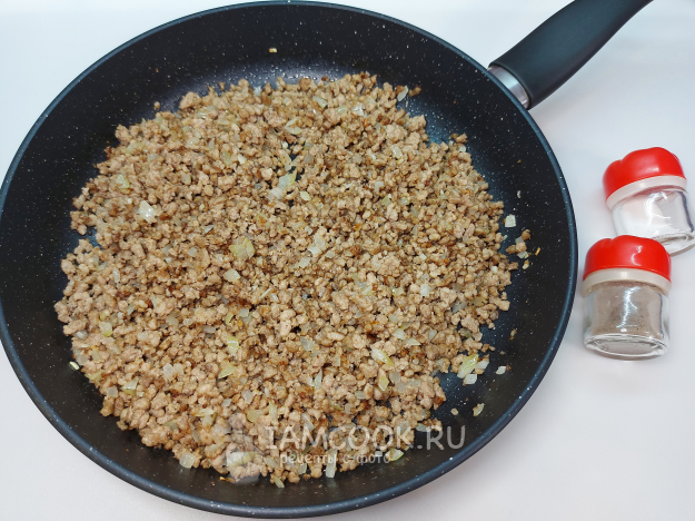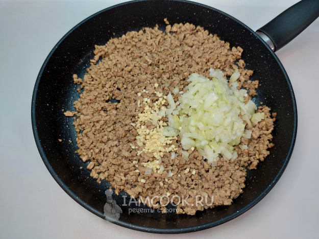 На среднем огне обжариваю фарш до испарения жидкости, разбивая крупные комочки. Как только влага испарится, добавляю лук и чеснок, обжариваю ещё несколько минут.