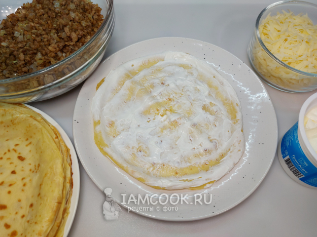 Всё готово - можно приступать к сборке торта, лучше это делать сразу на противне, смазав его растительным маслом или застелив бумагой для выпечки, можно использовать форму для запекания. Первым слоем я кладу 2 блинчика и смазываю очень тонким слоем сметаны, дальше я буду использовать по одному блинчику.