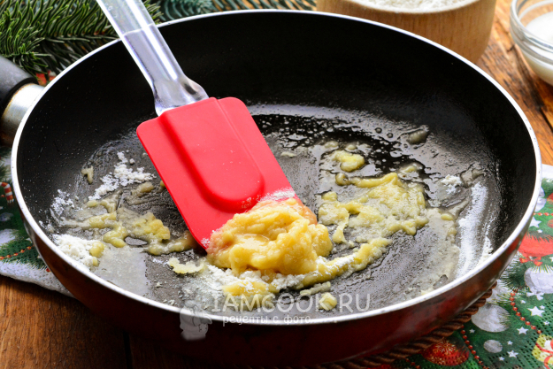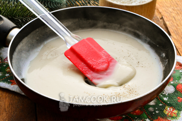 Приготовьте соус для жульена: растопите сливочное масло на сковороде, всыпьте муку, перемешайте и обжаривайте все вместе 10-20 секунд. Постоянно помешивайте муку.